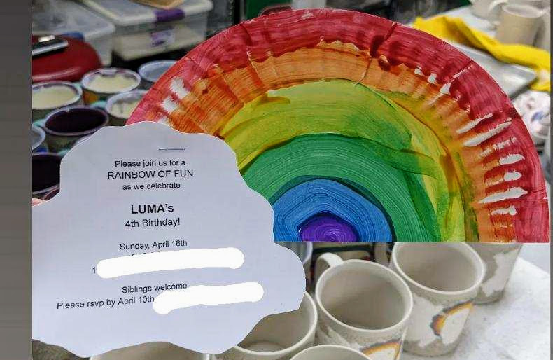 We invited her preschool class (about 10 kids + siblings!) and parents stayed as well because there is no way I can handle that many 3/4 year olds! For invitations my daughter helped me paint paper plates in the order of the rainbow. I then cut plates in half and printed out the party info, cut it out in the shape of a cloud and stapled it to the paper plate. They turned out great- and the best part was that my daughter helped make them!
