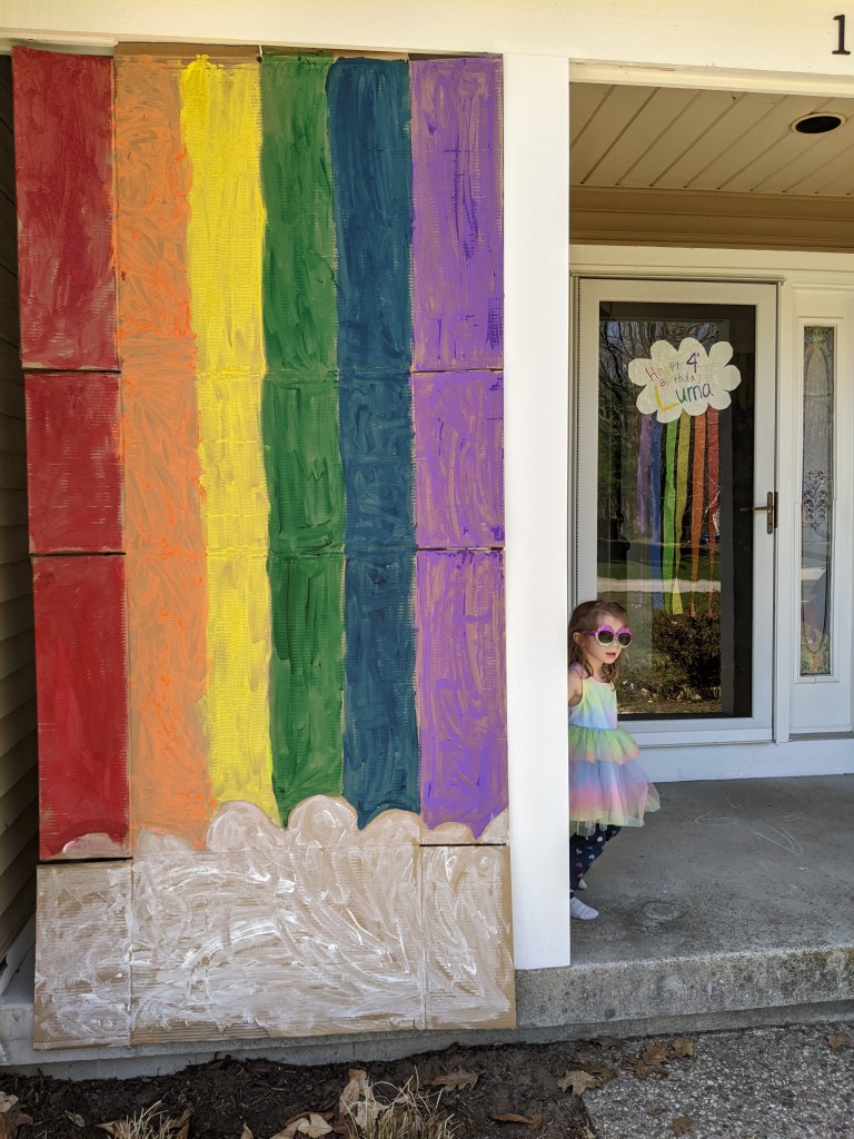 Decorating the outside is just as fun- so everyone knows it’s the party house! Lucky for me we had just purchased a new toilet so I used the box to paint a giant rainbow on it to hang up outside.
