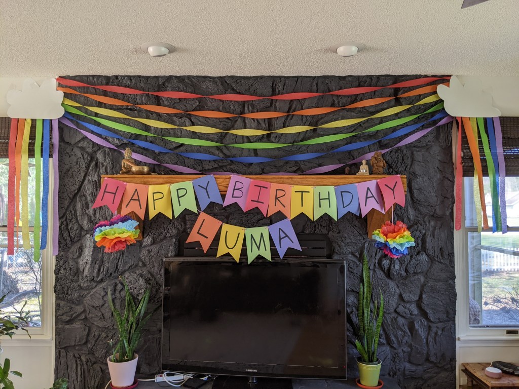 Decorations and food are just as important- especially when you have parents staying! Crepe paper in the color of the rainbow throughout the house goes along way! but so do decorations and table settings you don’t have to DIY!